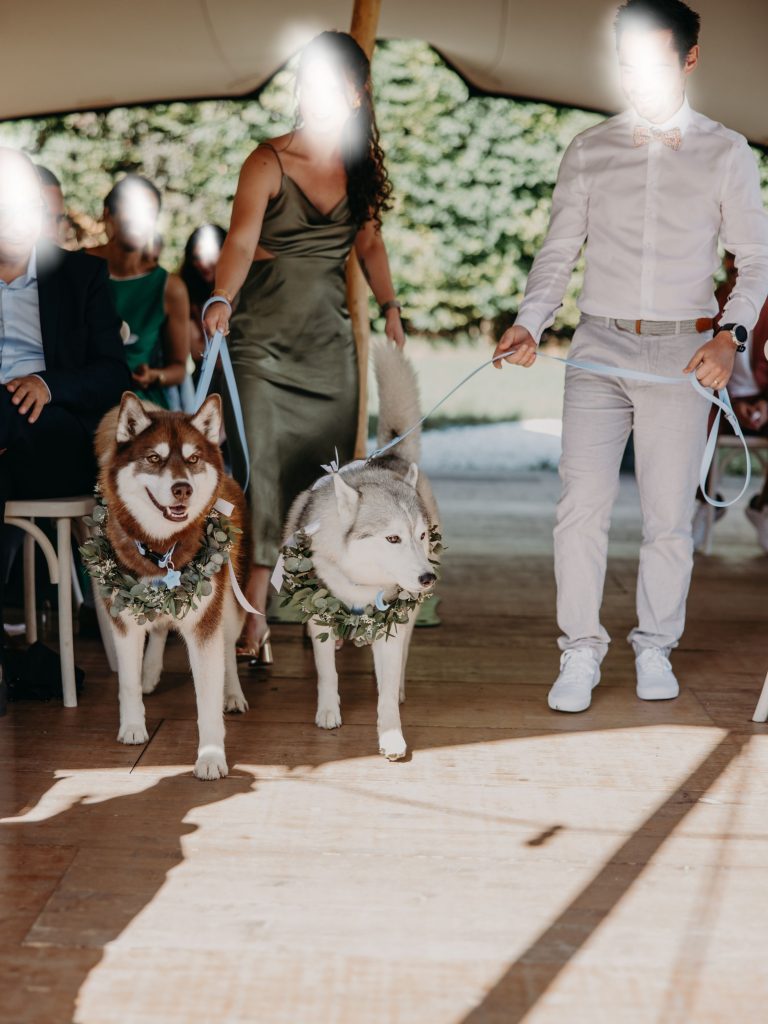 On a confié la mission à un couple d’amis à nous (qui a aussi des huskies) qui connaissent nos chiens depuis bébé : ils devaient les prendre avec eux jusqu’au lieu de réception, les amener à la cérémonie et rester avec eux le temps qu’on puisse faire toutes les photos. Ensuite durant le cocktail, nos amis les ont ramené à la maison et leur on donné à manger. Et en rentrant le soir ils les ont sortis et le lendemain matin ils les ont ramené au brunch.
