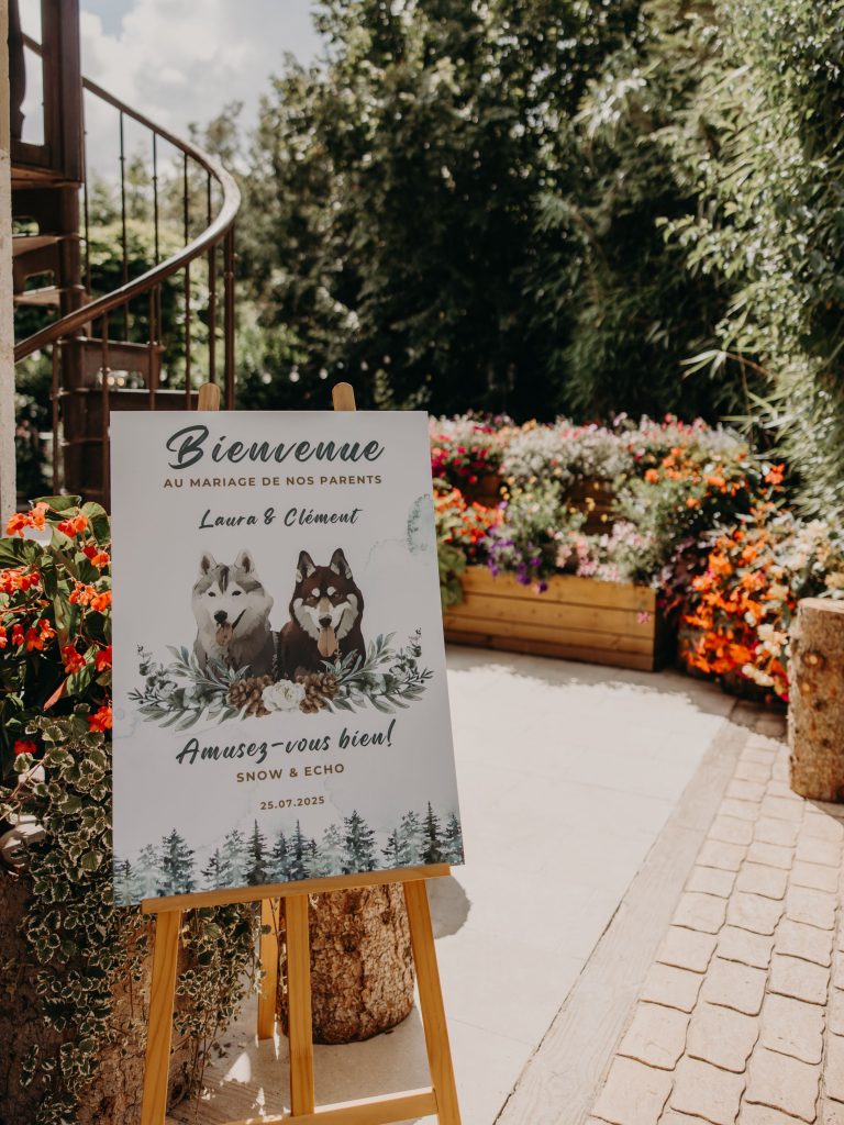 A notre mariage, les chiens étaient omniprésents et j’avais envie qu’ils fassent partie de la fête jusqu’au bout. Tout a commencé avec la papeterie du mariage : j’ai inclus 2 loups sur les save the date, les invitations et les menus en petit clin d’oeil à Snow et Echo. Ensuite notre panneau de bienvenue était conçu comme si les chiens qui l’avaient fait. J’ai également fait un bar à friandises pour les chiens avec des petits sacs de friandises à prendre à la maison pour régaler les toutous de nos amis. Et enfin le point culminant ce sont ces grands panneaux taille XXL où j’ai fait imprimer la tête de Snow et Echo en gros pour danser avec nous toute la soirée, c’était excellent !