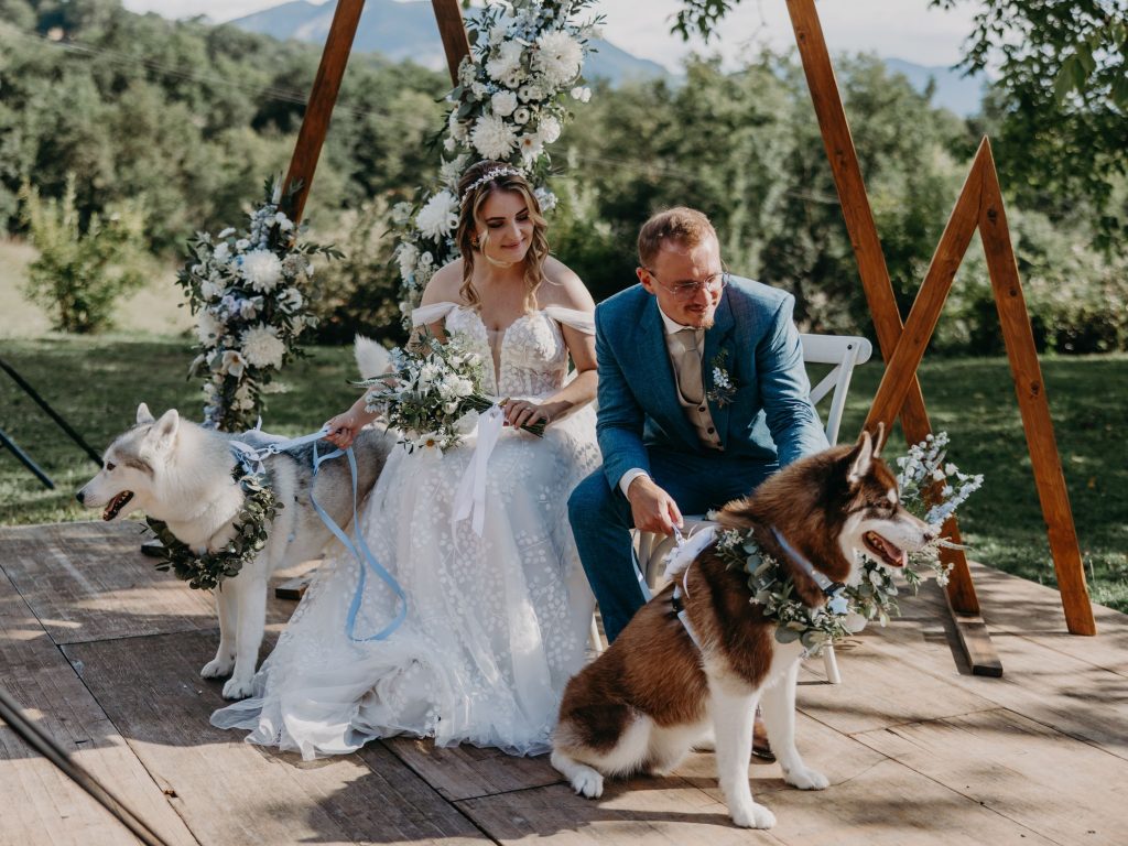 Lors de nos visites de lieux de réception, on s’était tout de suite mis d’accord sur un point non négociable : nos chiens doivent être acceptés ! Nous avons visité 3 lieux avant de choisir le nôtre, et dans le 1er où nous nous sommes rendus, la personne nous a tout de suite dit que les chiens n’étaient pas acceptés. J’ai personnellement écourté la visite du lieu car c’était vraiment très important pour moi que Snow et Echo puissent être avec nous pour ce jour si important.