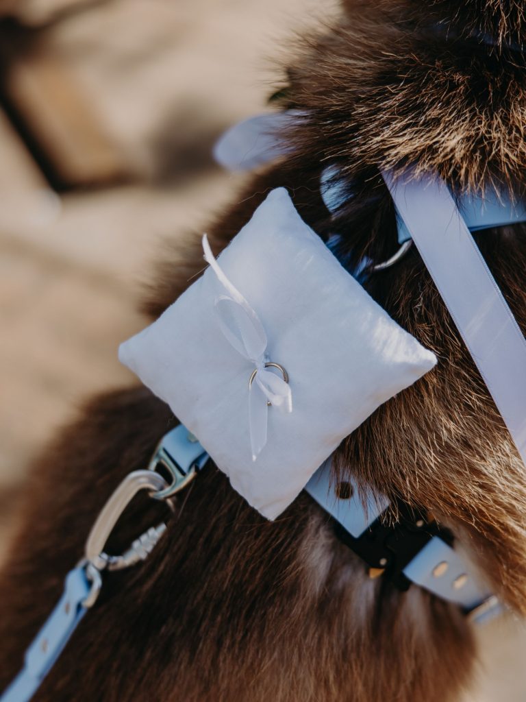 Tu peux aussi lui faire porter les alliances de plusieurs manières : avec un petit coussin sur le harnais, une mini pochette au collier ou pour les plus ambitieux, un panier qu’il tiendrait dans la bouche.