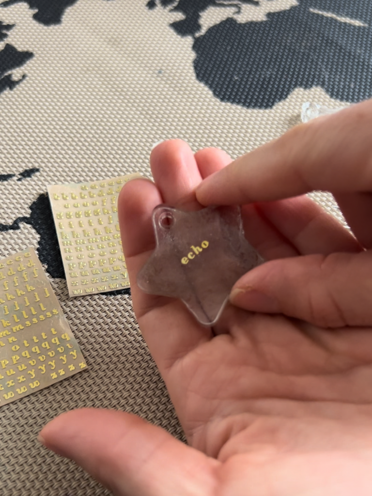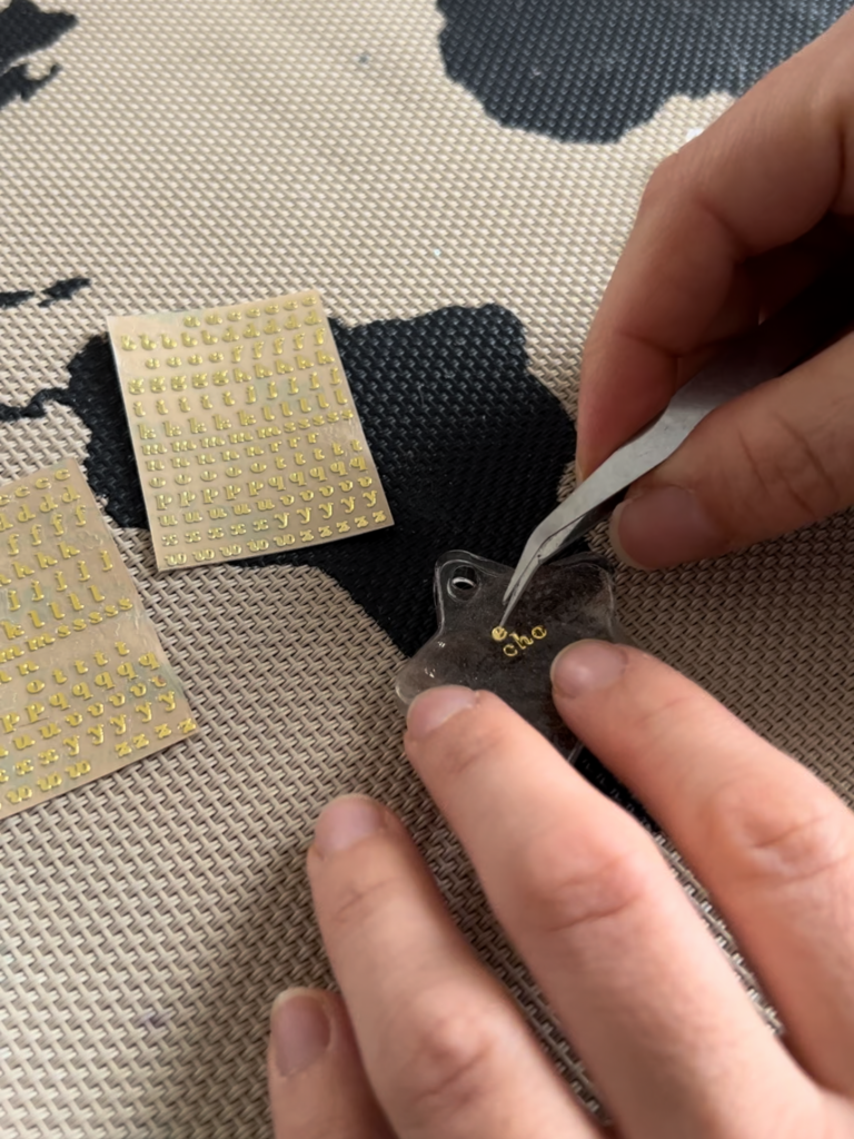 Libre à toi de choisir ce que tu veux faire, pour ma part j’ai pris des stickers en forme de lettre, que je suis venue doucement coller sur la médaille à l’aide d’une pince à épiler.