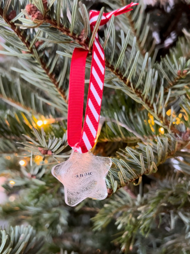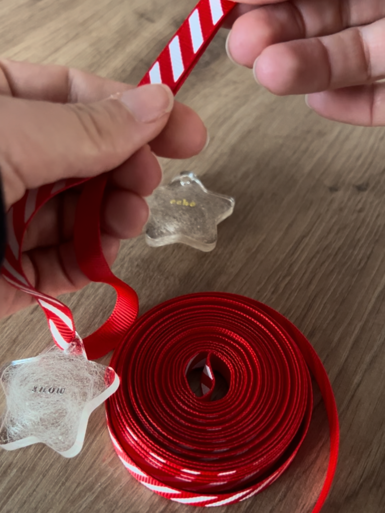 La dernière étape consiste à ajouter un ruban à ta médaille pour un faire un ornement de sapin de Noël. Pour ma part j’ai choisi un ruban rouge et blanc, mais tu peux mettre n’importe quelle couleur ou motif.