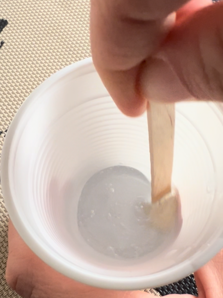 Il faut bien peser les deux solutions et les mélanger dans un gobelet en plastique durant quelques minutes avec un bâtonnet en bois. Pas la peine d’en faire trop, une petite quantité suffira.