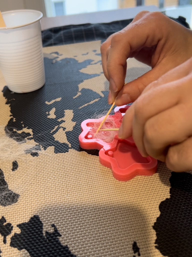 Maintenant que tout est prêt, tu peux commencer à couler ta médaille. Verse un peu de résine dans ton moule en silicone, puis ajoute les poils de ton chien.