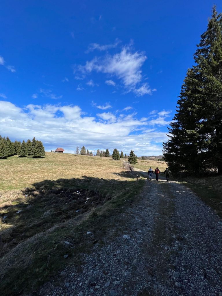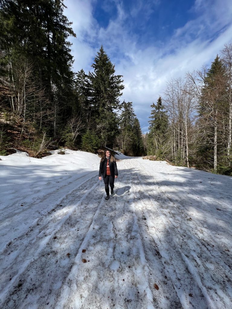 La randonnée commence au parking au niveau du village tipi, et on emprunte un chemin forestier pendant une bonne partie de la randonnée. Lors de notre passage, il restait encore un peu de neige sur le sentier, qui croise d’ailleurs des pistes de ski de fond.