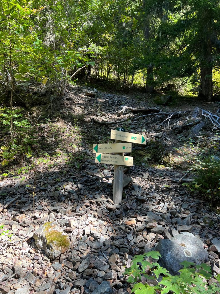 On démarre donc notre randonnée au parking de la gare des Houches. Ensuite il faut passer sur la route au dessus du petit pont et aller directement à droite sur le chemin. Un panneau d’affichage indique immédiatement la Statue du Christ-Roi, qu’il faudra suivre tout le long.