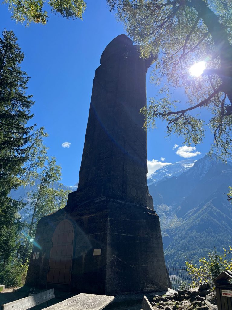 Eh bien c’est l’idée qu’à eu dans les années 30 un abbé de la région, qui était aussi le curé de la ville des Houches. Son projet ambitieux est validé par le Vatican, et la statue est réalisée en 1 an à peine. A l’intérieur de la statue se trouve une petite chapelle, dans un style Art Deco.