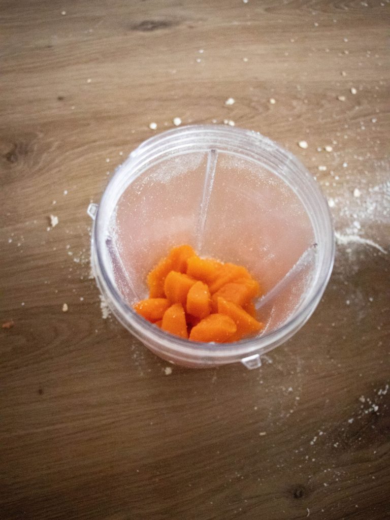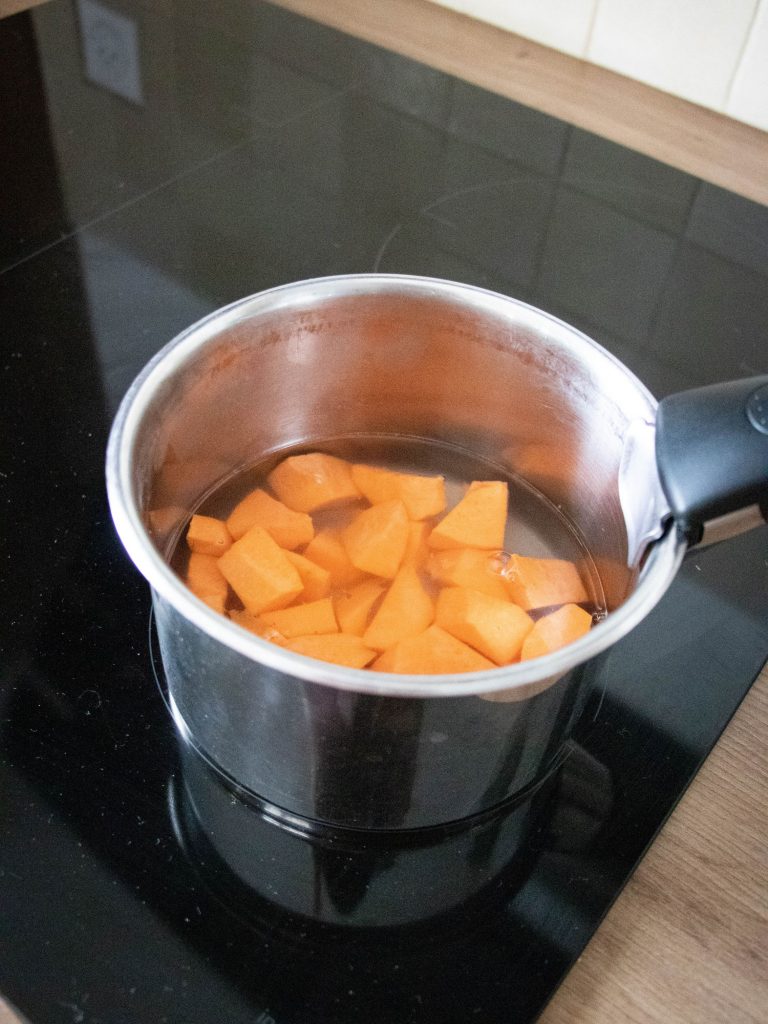 Epluche la patate douce et coupe la en petit dés. Ensuite fais cuire à l’eau ou à la vapeur environ 15/20min jusqu’à ce que la patate douce soit bien molle. Tu peux tester la cuisson en piquant la pointe d’un couteau dans un morceau de patate douce. Une fois qu’elle est bien cuite, mixe la avec un peu d’eau pour obtenir une texture onctueuse.