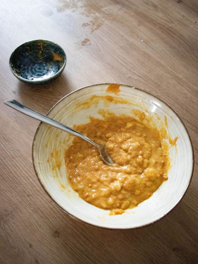 4. Ajoute la purée de patate douce (ou de potiron), le beurre de cacahuète et l’œuf
