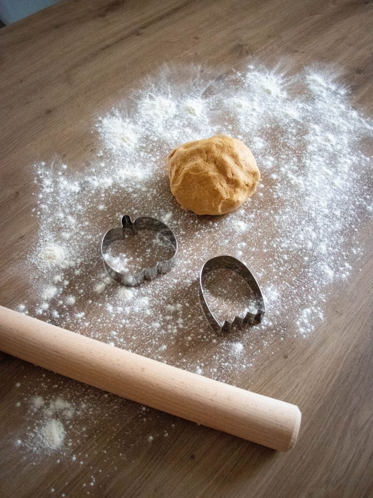 Mets un peu de farine sur ton plan de travail. Utilise un rouleau à pâtisserie pour étaler la pate. Il faut qu’elle ait une hauteur de 0,5cm d’épaisseur, comme pour des sablés maison. Ensuite, tu peux te munir de tes plus beaux emporte-pièces d’automne pour faire de jolies formes. Si tu n’en as pas, tu peux faire la forme que tu souhaites avec un couteau.